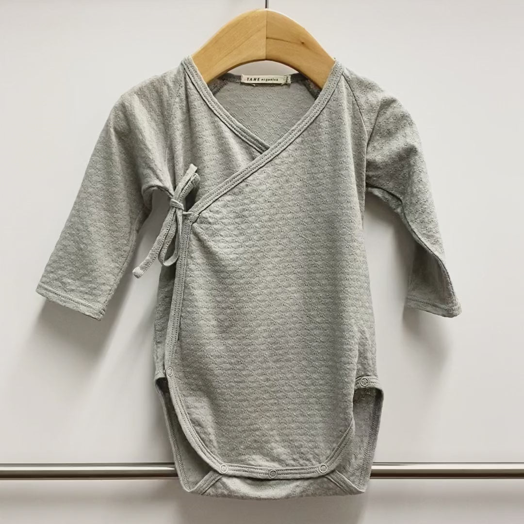TANE kimono onesie in 100% organic cotton, and delicately pointelled.  Its double tie front makes it easy to get in and out of.  Tiny snaps attached on fine binding provide security while assuring utmost comfort for the baby.  The perfect layette to welcome any newborn.